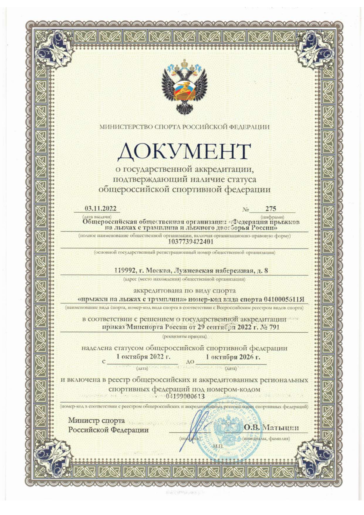 Документ о государственной аккредитации, подтверждающий наличие статуса общероссийской спортивной федерации "Прыжки с трамплина"